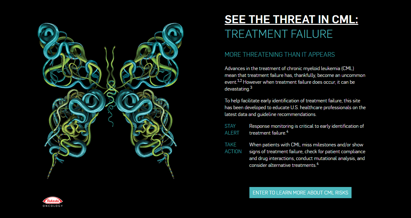 Even though the T315I mutation worsens the outcomes, few physicians tested for it, and didn't see the need to switch patients. Ariad launched a branded website, CMLrisks.com, using the image of a butterfly made from snakes – "more threatening than it appears" – to suggest that treatment failure due to resistance puts patients' lives unnecessarily at risk.